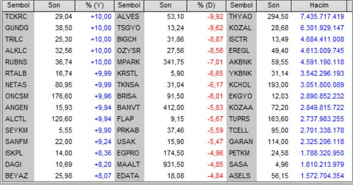 | XXX hissesi %X artışla | YYY hissesi %Y düşüşle |